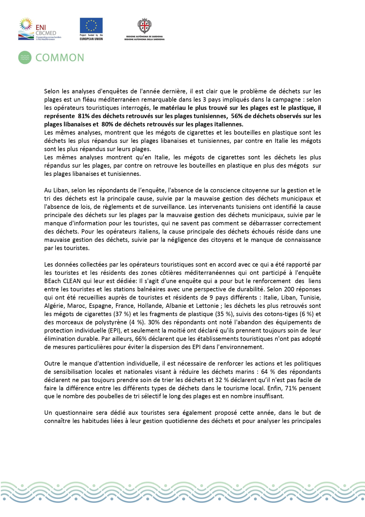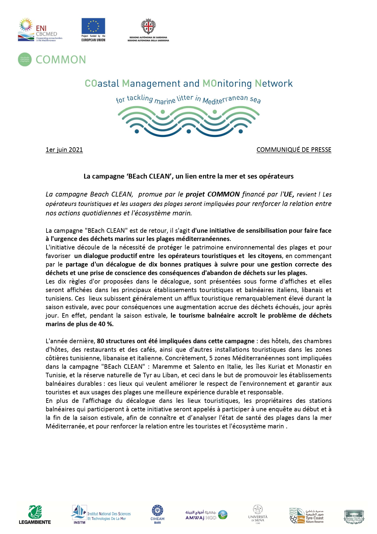 L'équipe du projet COMMON à Institut National des Sciences et Technologies de la Mer (INSTM) lance officiellement la campagne "BEach CLEAN", une initiative de sensibilisation dédiée aux opérateurs touristiques de Monastir, pour faire face à l'urgence des déchets marins sur les plages méditerranéennes.